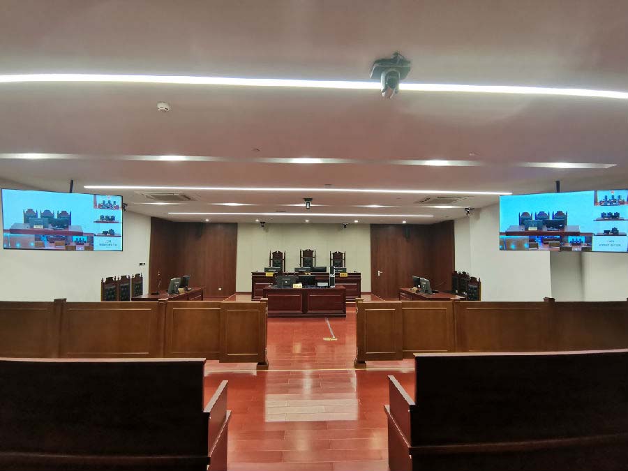 审理庭内的旁听人员通过庭内大屏幕显示设备;审理庭外的公众通过互联网系统,对公开审理的各类案件实现透明公开的了解和监督。