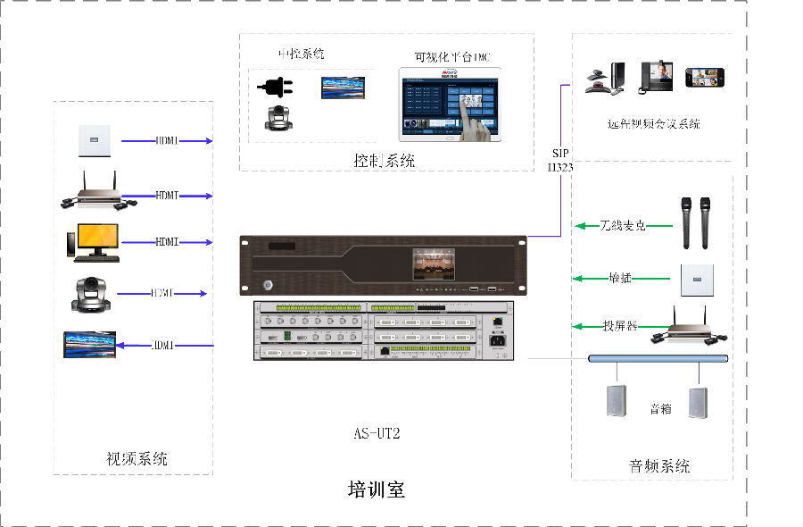 项目包含:本项目共建设1个培训室,使用1台视通科技(AVSYS)多媒体综合管理一体机,实现统一控制管理,音视频调度,会议室互动等应用。