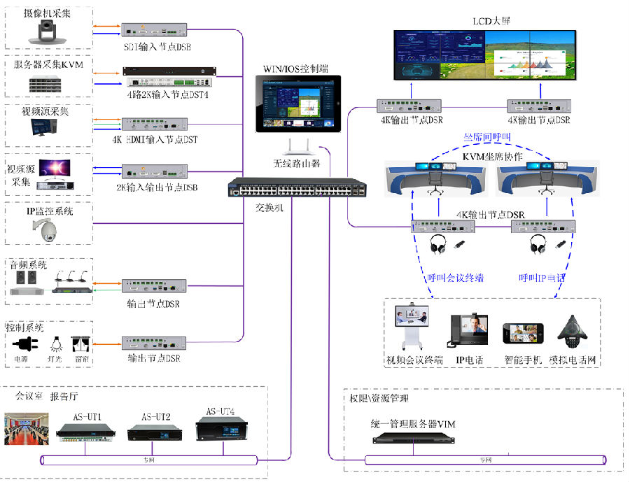 3、 会议室,报告厅,VIP室采用视通科技音频、视频、控制、录播、视频会议、多方交互MCU六大功能于一体的综合一体AS-UT主机,便于部署、便于实施、便于维护。