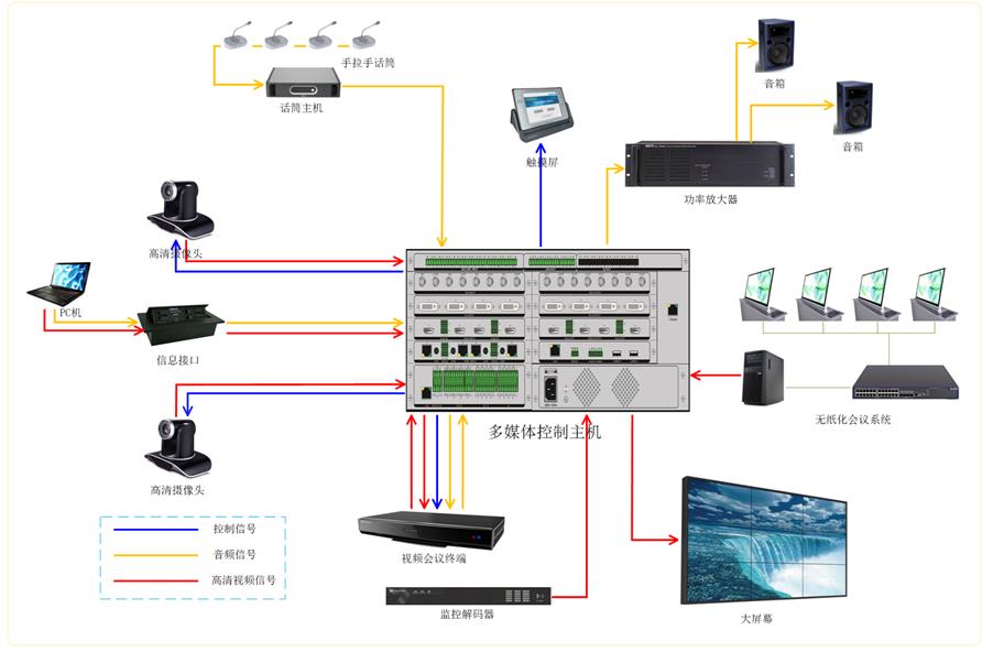 2、多媒体控制系统:采用视通科技生产的多媒体会议室核心设备----多媒体控制主机,集高清混合矩阵、数字音频处理器、集中控制主机、高清录播服务器于一体。